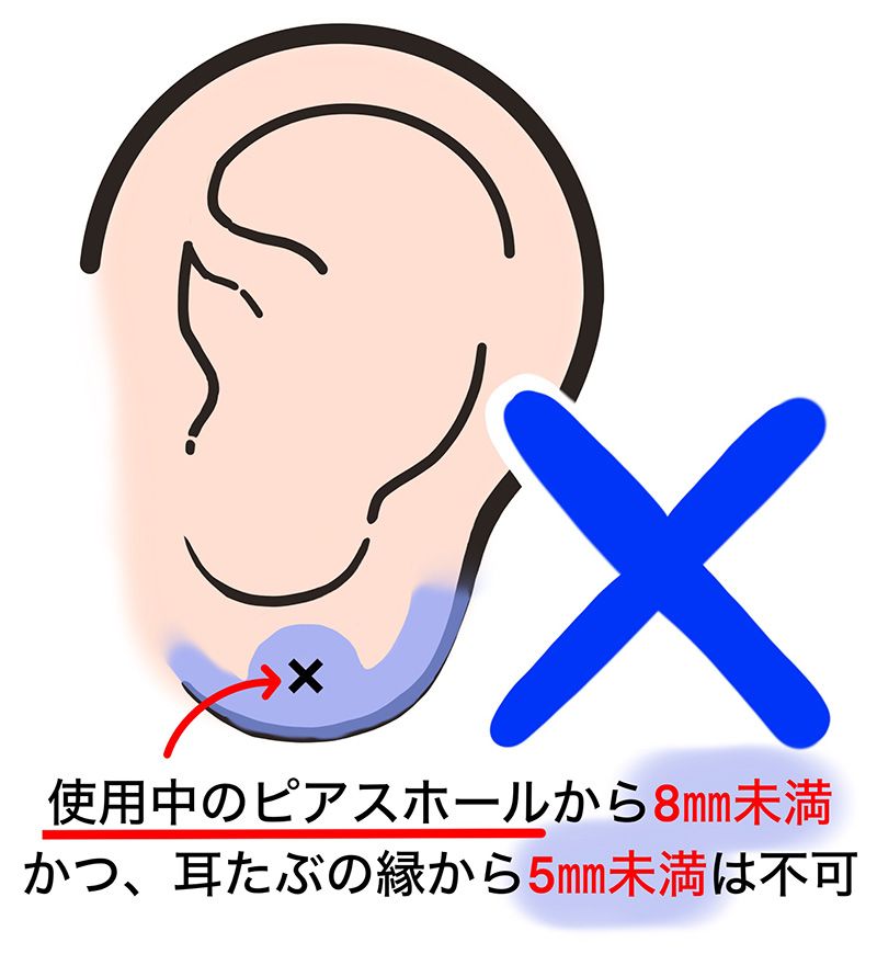 治癒途中の傷付近にピアッシングするとトラブルの元になりかねないので、当院でピアスの開け直しができるのは最後にピアスホールを使用してから6ヶ月以上経過した方のみが対象になります。