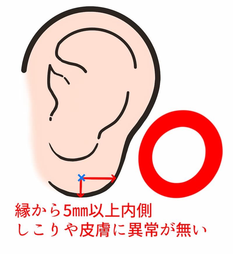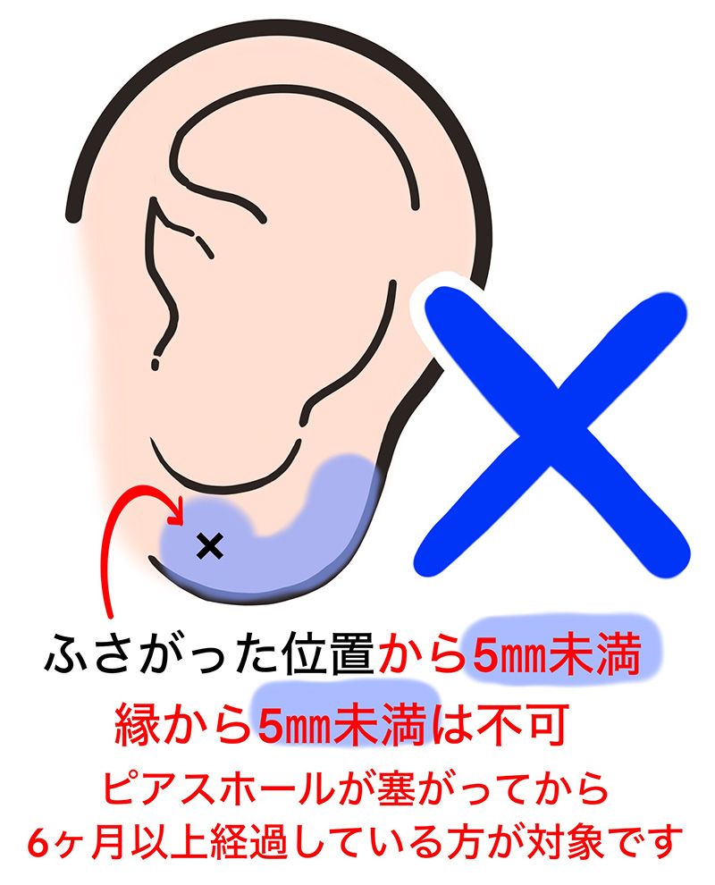 耳たぶの極端に下の部分にピアスホールを開けると 後々にセカンドピアスの重みで耳たぶがさけてしまうことがあります。当院では耳たぶのふちより5mm以上内側の場所にピアッシングを行っています。 安全で、きれいに見える所にピアッシングを行うようにご本人と相談の上で位置決めします。